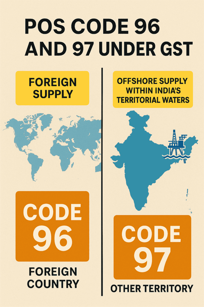 GST POS codes play a key role in taxing supplies correctly under India???s GST law. Code 96 flags inter-state supplies to foreign countries, while Code 97 flags inter-state supplies to Indian ???other territories.??? Moreover, using the right code ensures proper IGST treatment and ITC eligibility.